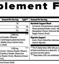 Ingredients: Barley Grass Powder (leaf), Broccoli Powder (Brassica oleracea)(leaf), Spirulina Powder (Arthrospira plutentis)(whole plant), Green Tea Powder (leaf), Alfalfa Extract (whole herb), Wheat Grass (Triticum aestivum L.)(leaf), Beet Root Powder (Beta vulgaris)(root), Hibiscus Powder (flower), Strawberry Juice Powder (fruit), Cranberry Powder (Vaccinium macrocarpon L.)(fruit), Acai Juice Powder (fruit), Blueberry Extract (berry), Pomegranate Powder (fruit), Cinnamon (Cinnamomum cassia)(bark), Turmeric Extract (root), Panax ginseng Powder (root), Ashwagandha Powder (root), Mangosteen Extract (Garcinia Mangostana L.)(pericarp), Black Pepper Extract (fruit), Inulin (from Helianthus tuberosus)(root), Ginger Powder (root), Sodium Alginate